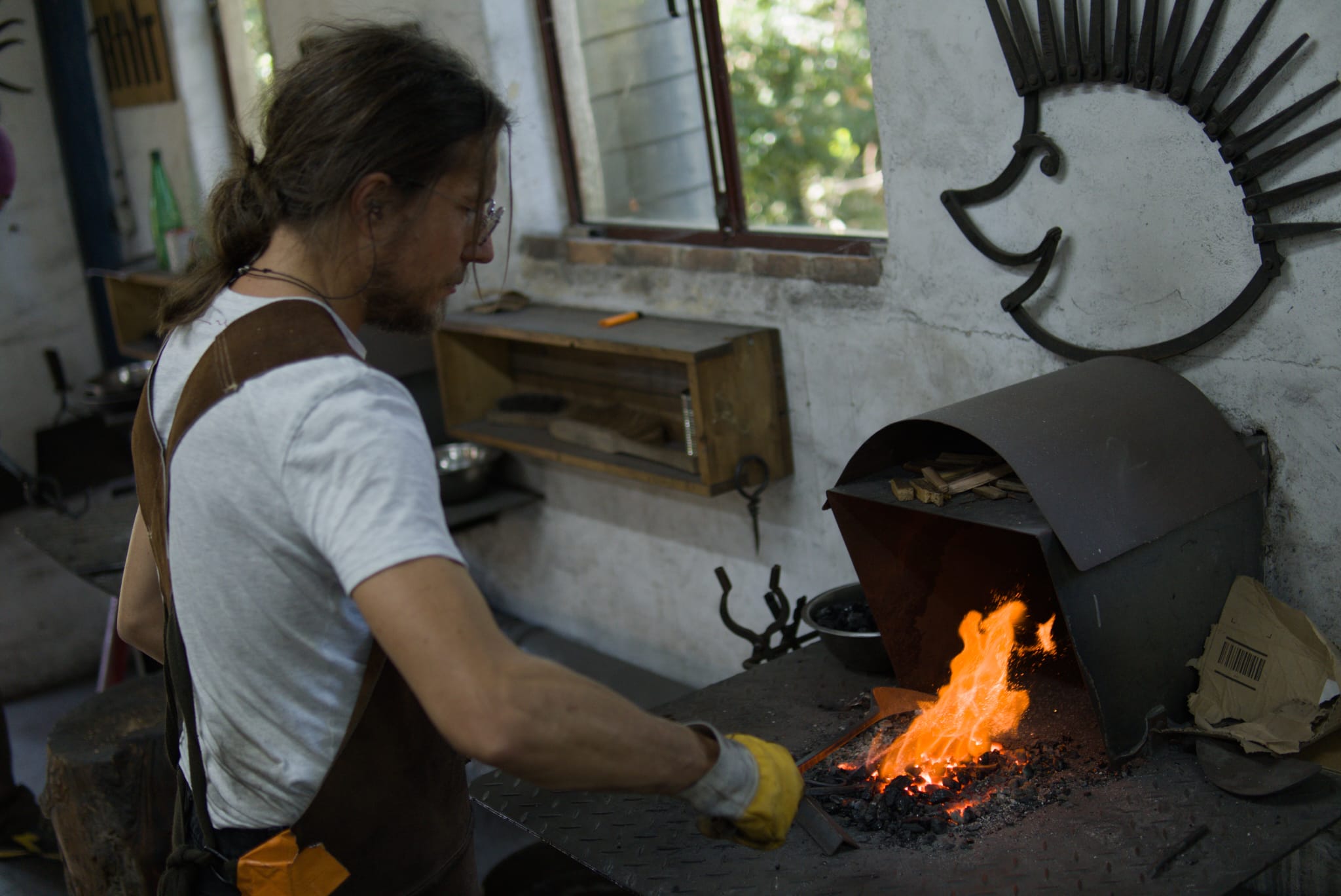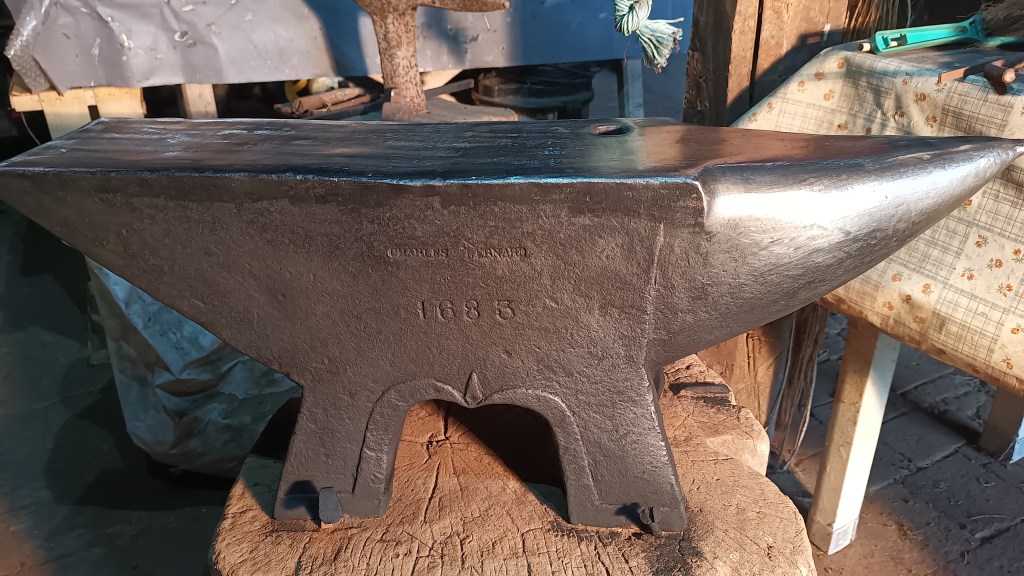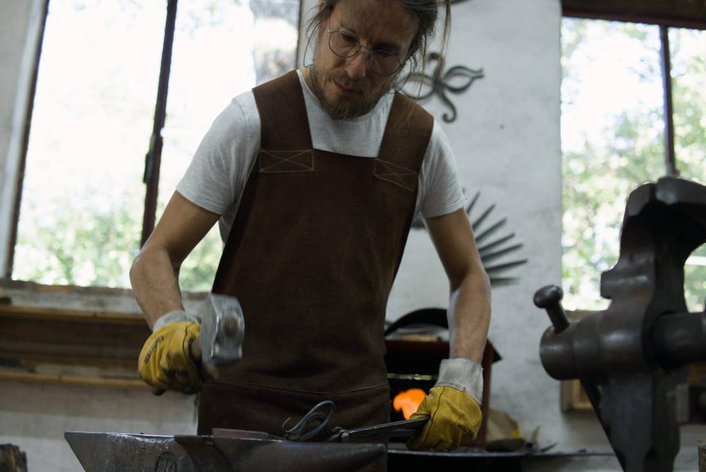 Forge à charbon traditionnelle. Les lames sont modelées au maximum entre l’enclume et le marteau pour être les moins usinées possible.