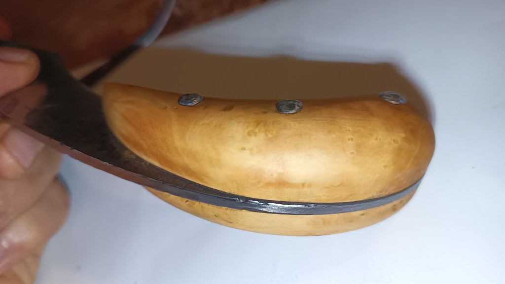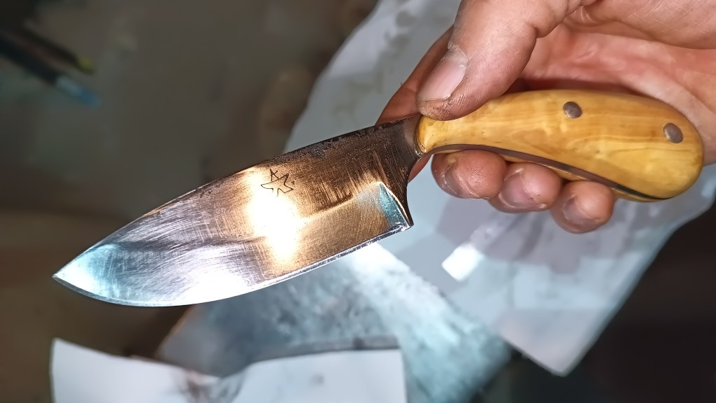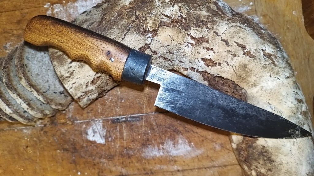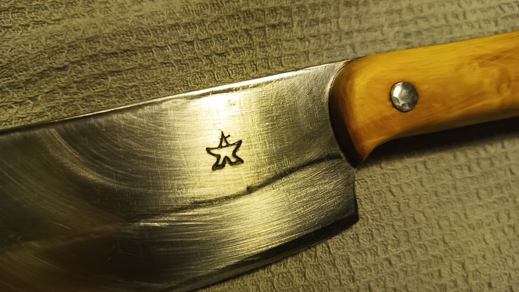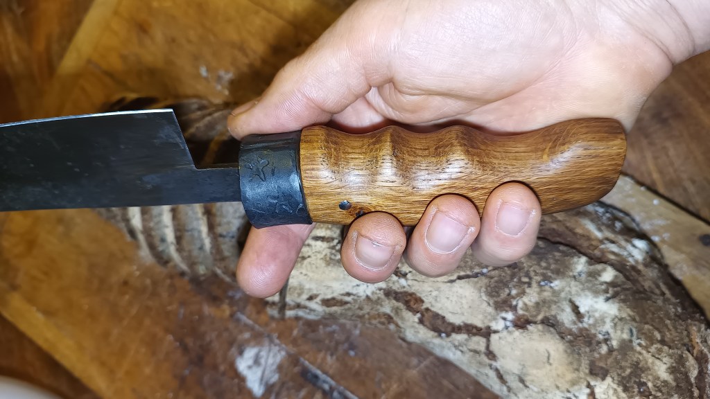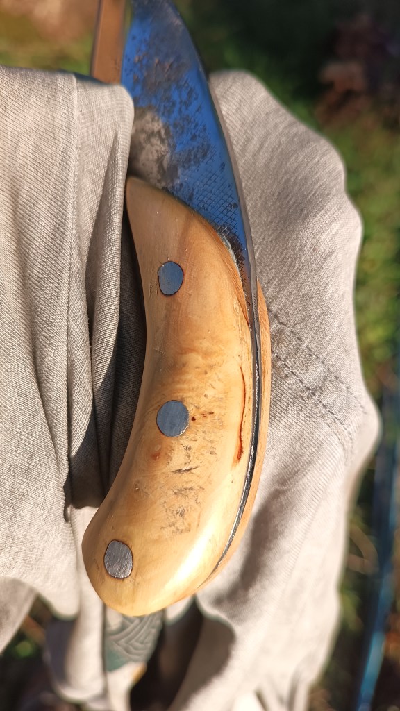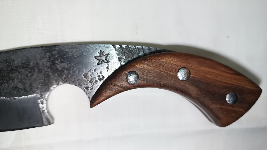Couteau de style médiévalFeuilleBijou de couBijou initialeCouteau d’inspiration Japonaise – KiridashiManche en buisCouperetPoinçonRivetage à têtes débordantesTenailles de forgeManche en ormeCouteau d’office – manche en pêcher et ébèneSupport de couteauCouteau forgé dans un boulon