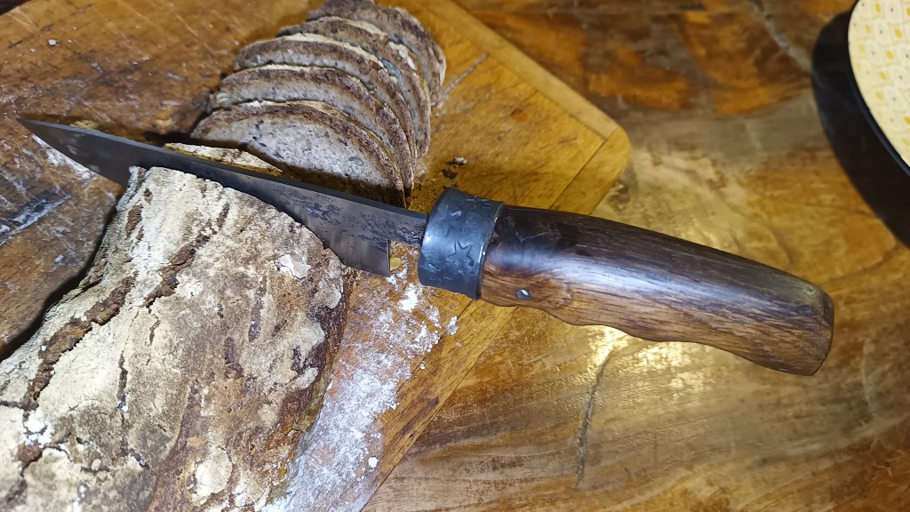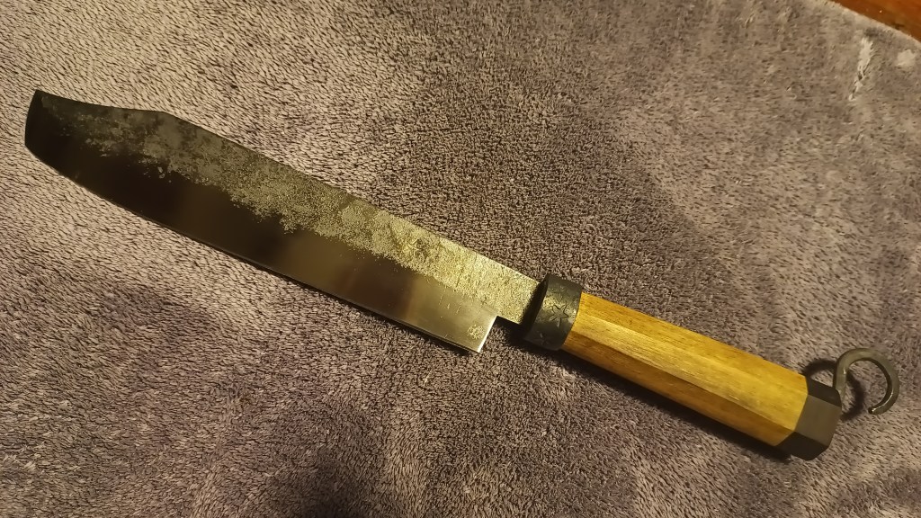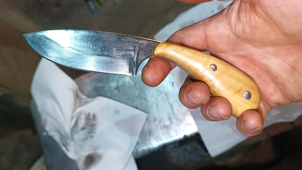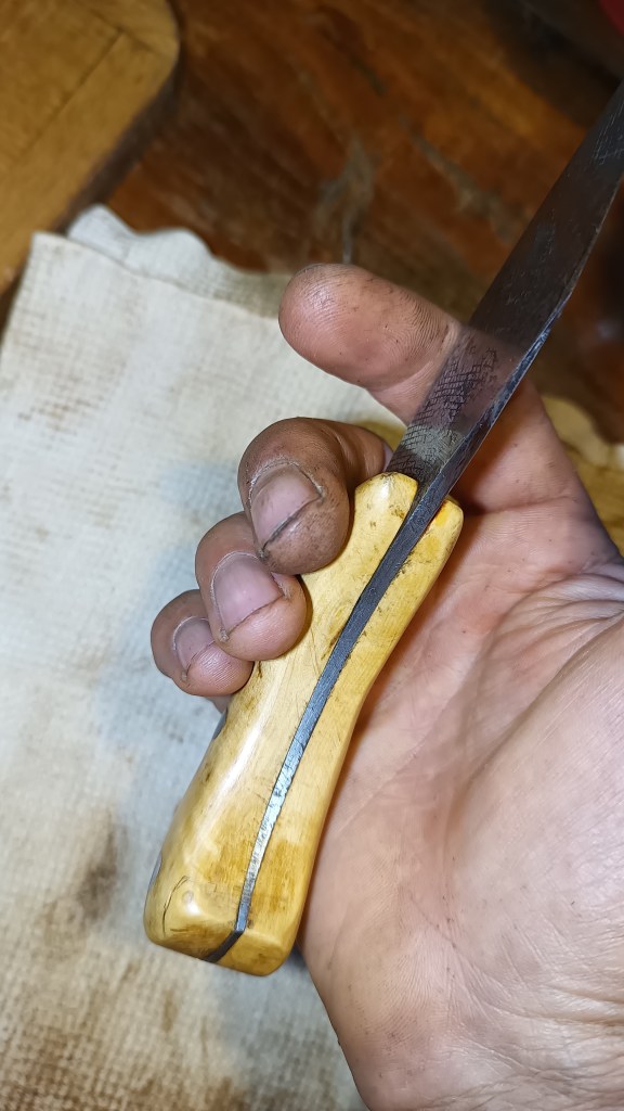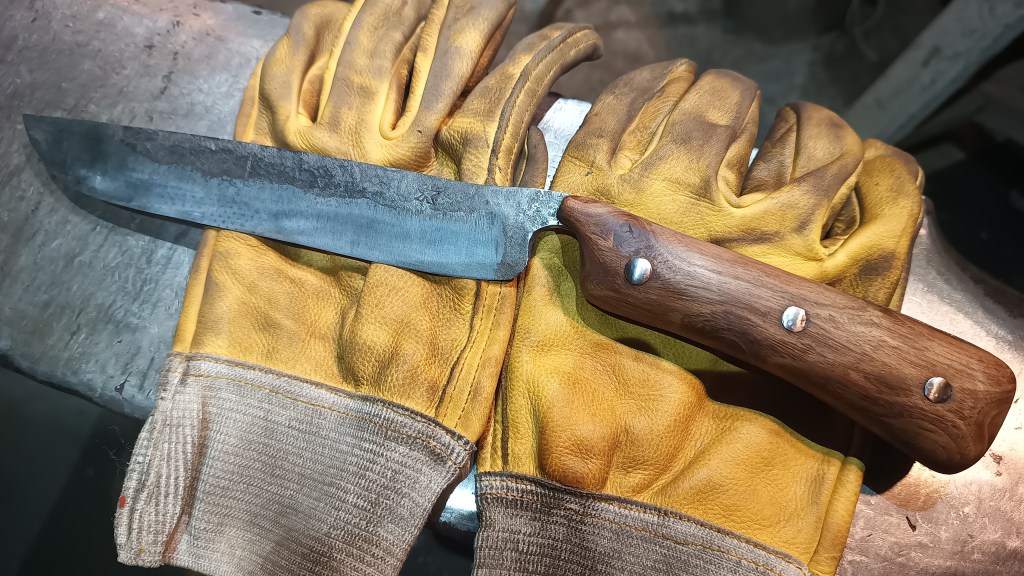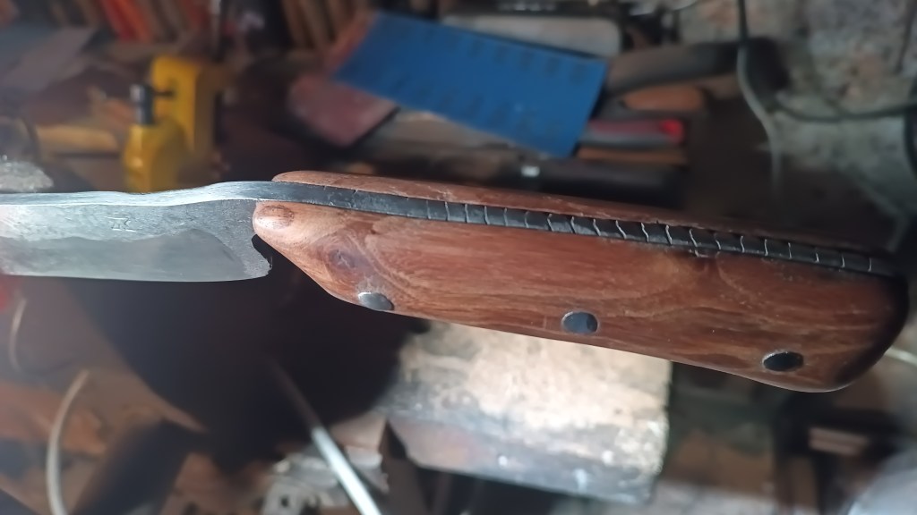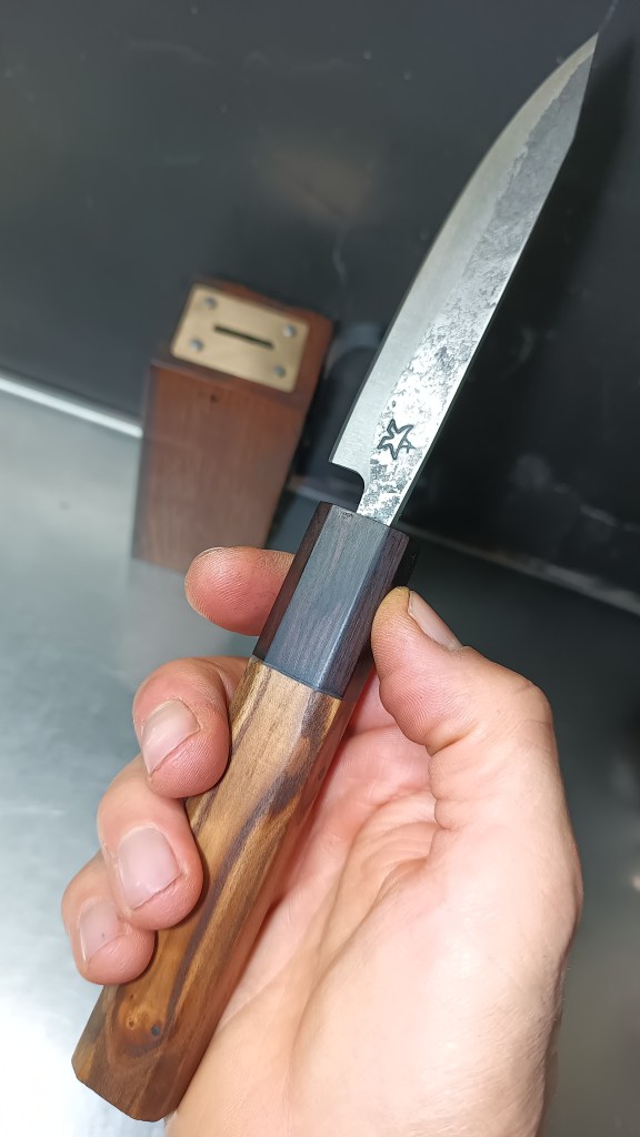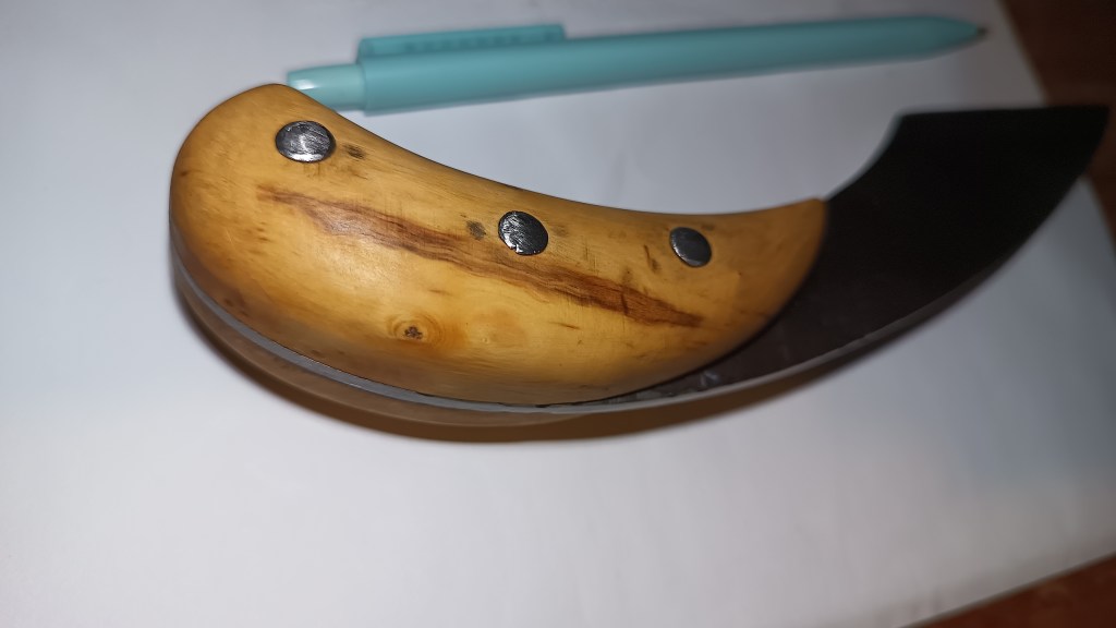 Couteau de style médiévalFeuilleBijou de couBijou initialeCouteau d’inspiration Japonaise – KiridashiManche en buisCouperetPoinçonRivetage à têtes débordantesTenailles de forgeManche en ormeCouteau d’office – manche en pêcher et ébèneSupport de couteauCouteau forgé dans un boulon